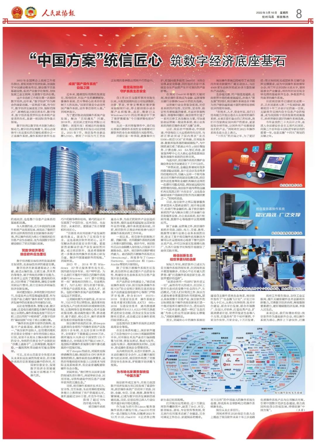 2022年3月10日,《人民政协报》第8版刊发《“中国方案”统信匠心 筑数字经济发展基石》一文,聚焦中国操作系统与数字经济发展。统信匠心打造“中国方案”,赋能千行百业数字化建设,给世界更好的选择。