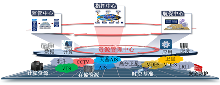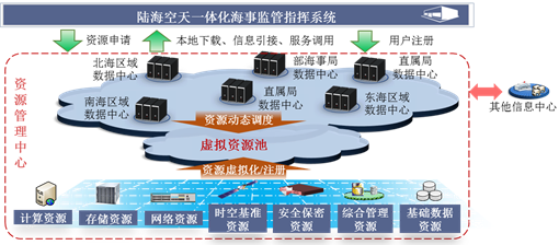 1.建立海事资源管理中心。基于部海事局、区域协调中心和直属海事局的资源设施,构建地理分散部署、功能逻辑一体的资源管理中心,实现信息感知资源、通信网络资源、计算存储资源、时空基准资源、安全保密资源、综合管理资源和基础数据资源的管理和维护,为陆海空天一体化监管指挥提供多样化资源服务,包括基础设施、数据、服务和运维等。资源管理中心建设示意图如图4所示。