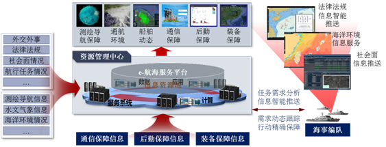 4.建立航行保障中心。依托资源管理中心,构建陆海空天一体化船舶航行计划管理体系,实现航行计划的集中统一管理,形成航行计划“一张表”;同时基于水上动态监管中心跨域汇聚融合数据,构建航行保障信息服务资源池,打造e-航海服务平台,为政府/企业/社会按需提供船舶动态等服务。此外,该中心还为远海任务船舶提供外事、法律、测绘和通航环境等信息服务,依托北斗和海事卫星等手段,提供岸海融合通信服务,对任务行动提供精准的航海保障。航行保障中心建设示意图如图8所示。