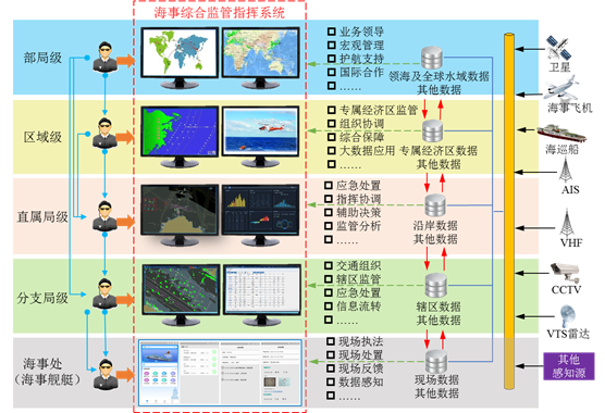 2.缺少合理的监管指挥体系和统一的信息化支撑平台。当前,海事部门遂行的水上交通安全管理仍以辖区进行划分,主要手段为VTS,承担VTS管理职能的船舶交通管理中心仅负责交通态势监视和水上交通组织管理;水上交通违法执法由海事处或执法大队承担;水上险情处置和应急搜救任务,由水上应急指挥中心负责,监、管、救目前处于分割状态。另外,部海事局对直属海事局的领导更多体现在宏观决策和指挥,因缺少能够掌握全国水上交通宏观状况的手段,导致其无法有效收集各直属海事局的监管动态及全球水上交通态势,在指令下达方面仍以简单的语音和文字形式实现。各直属海事局的信息化发展水平和层次也存在较大差别,个别海事局虽建有监管指挥系统,但也只能在近岸区域内开展海上安全监视和交通管理,在直属海事局间以及跨区域时无法实现监管数据共享和应急指挥的协同,且不具备海上应急处置的信息化和智慧化能力。综上,部海事局及所有直属海事局在海上安全监管和应急处置方面无法形成合力,无法充分发挥“1+1>2”的效能。