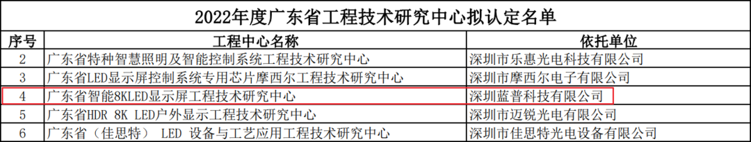 据了解,广东省工程技术研究中心主要依托省内创新型企业、高新技术企业等综合实力和创新能力较强的科技型企业建设。此次蓝普获批广东省工程技术研究中心,是对公司在超高清LED显示领域的技术创新、研发实力、科技成果应用转化等综合实力的充分肯定,同时对进一步夯实集团科技创新新动能具有重要意义。