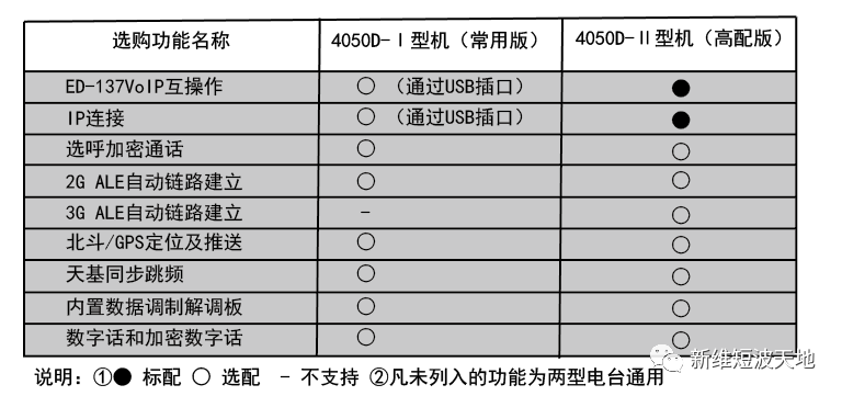 根据用户的使用要求不同,4050D按功能配置分为Ⅰ型机和Ⅱ型机,二者技术参数相同,但Ⅱ型机配置更高,支持配加3G-ALE等高端功能。