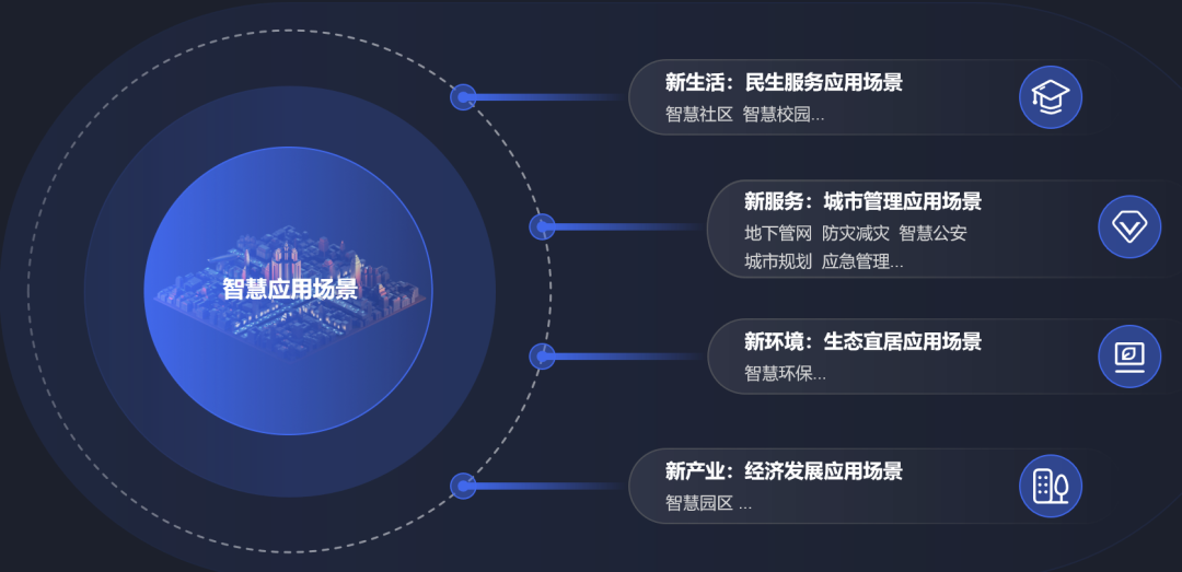 基于智慧城市平台支撑能力,围绕城市经济社会各领域信息化的发展需求,聚焦人民群众的重点关切和政府部门的业务需求,在智慧城市的各个领域开展了应用产品的研发与建设,为新生活、新服务、新环境、新产业应用场景赋能。