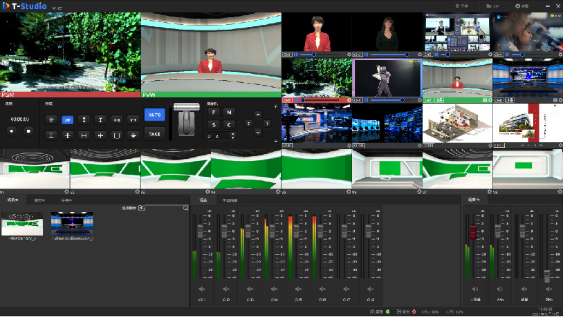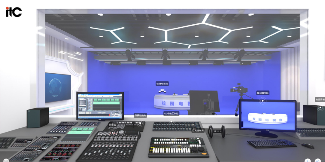 itc虚拟录播系统采用无轨虚拟抠像技术,内置色键抠像,一套设备可完成智能抠像、多镜头切换、虚拟场景等功能。场景库自带600多套三维虚拟场景,涵盖财经资讯、气象天气、国防军事、科技时尚等19种类型,可设置不同角度的虚拟场景机位,完全满足演播室机位的切换要求,抠像效果细腻,AI智能肤色识别美化处理,边缘自然。支持三维空间和三维模型,对场景进行个性化编辑,调整物件纹理以及贴图,插入事先设计预置好的三维虚拟场景,便能实现广播级图像输出,实现精细化、色彩丰富的虚拟场景呈现。