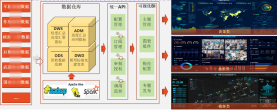 通过汇聚军队基础服务、行政审批、官兵信息、物资装备信息、训练等数据,依托大数据平台建立多维数据仓库,结合统一API管理为可视化BI工具提供数据支持。可视化BI工具包含丰富的图表组件,主题元素,模板选择等,支持快速配置数字可视化大屏。支撑分析决策类、监控运行类、协同指挥类数字大屏及驾驶舱建设。