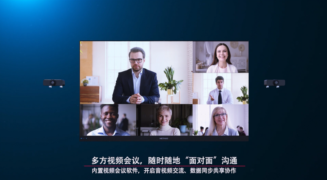 METAGO系列LED一体机产品采用了联建光电专利六向微调技术,屏体拼接平整,平滑如镜;同时应用了联建光电独创的智能喷墨技术,墨色一致性极佳,可大幅提升对比度。屏幕点亮后画质高清、色彩艳丽,3840Hz高刷新,显示流畅稳定,为与会者带来更优质的会议体验。