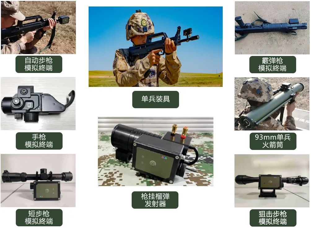 单兵班组武器模拟终端以单兵装具为基础配以不同类型的武器,其中,包含单兵装具、单兵头盔和实装加挂模拟武器终端,完成对单兵模拟对抗装备的配套,武器火力等级及毁伤性较轻武器有所提高,硬件部分增加模拟弹体。其中模拟火控单元和模拟弹,武器涵盖班用轻机枪、 35mm榴弹发射器、35mm狙击榴、80mm单兵火箭、93mm单兵火箭筒、120mm反坦克火箭筒、红箭73、红箭8等,完成对单兵班组模拟对抗装备的配套以及模拟对应武器的火力毁伤效能和被打击效能。