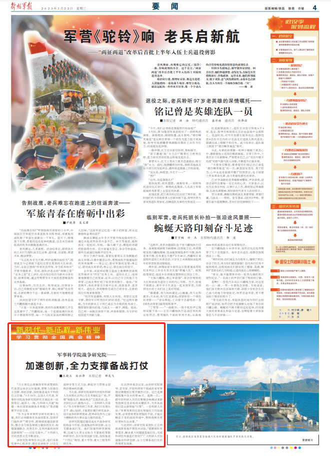 “习主席在出席解放军和武警部队代表团全体会议时强调,要聚力加强自主创新、原始创新,加快推进高水平科技自立自强。”3月15日,全国人大代表、军事科学院战争研究院研究员聂送来一回到单位,就深入一线,与科研人员就“构建一体化国家战略体系和能力”等话题展开讨论交流。