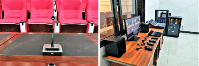 在报告厅的主席台前,每坐席配置itc数字会议发言单元,内置镀金振膜超心型指向性电容式咪芯,音质还原度高,抗信号干扰能力强,拾音距离远,能够保障会议全过程顺利开展,避免产生噪音和啸叫。
