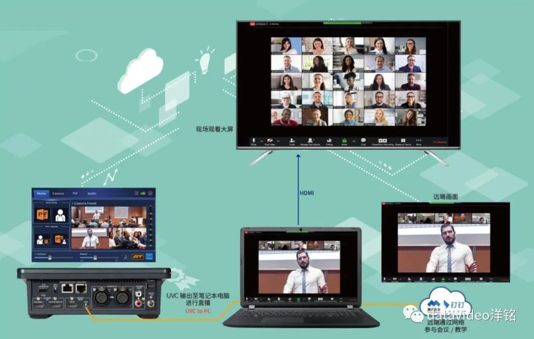 钉钉、腾讯会议等网络会议平台已经成为各大院校与企业日常所用,在不改变现有会议与教学流程的情况下,改变传统节点转换方式,可通过iCAST mini UVC视频输出接口,使用USB Type C数据线与会议软件连接。