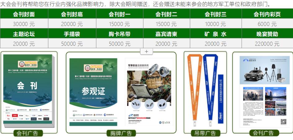 ◆军队和军工部门采购选型展会,高效推广集中采购——面向中央军委装备发展部、联合参谋部、训练管理部、后勤保障部等军委部局机关、全国各军工单位、陆军、海军、空军、火箭军、战略支援部队、联勤保障等军兵种部队、各大战区、武警部队、公安、航空、航天、兵器、船舶、雷达、电子、核电等军工集团和相关的科研院所、主管装备采购部门方面的首长领导、专家代表,北京国防信息化展是全军信息系统与装备指定的选型展会。
