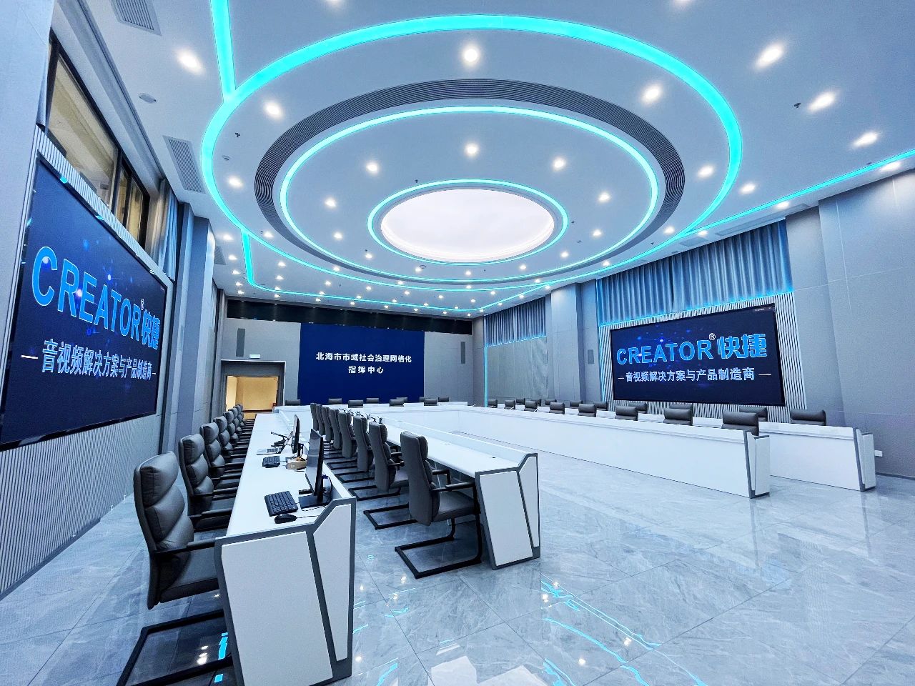 此次北海市市域社会治理项目建设中,在市域治理网格化指挥中心、决策会商室以及各楼层的大小会议室中均部署了CREATOR快捷ECIS可编程分布式坐席协作管理系统,中央控制系统和灵智K系列数字会议系统。助力打造日常监管运营、协调联动、综合会商、应急指挥一站式服务的社会治理联动指挥中心,高效打造北海智治市域社会治理平台,积极探索城市公共安全治理新模式。