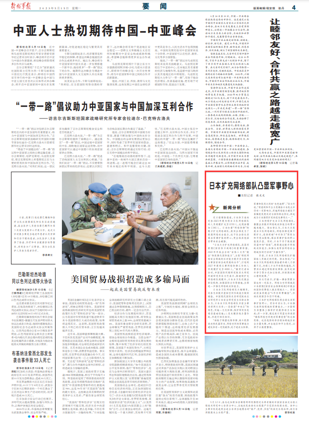 “日本大力扩充网络部队,是落实新版《国家防卫战略》的重要举措。2022年年底出台的‘安保三文件’提出‘彻底强化国防能力’,主张‘将把网络安全领域的应对能力提升至与欧美主要国家相当或更高的水平’,计划到2027年度将从事网络防御工作的人员规模扩充至4000人。”接受记者采访时,中国国际问题研究院亚太研究所副研究员孙文竹表示,除继续扩充网络部队规模外,日本自卫队还提出新设机构、加强国际合作等措施,企图进一步强化网络战攻防能力。