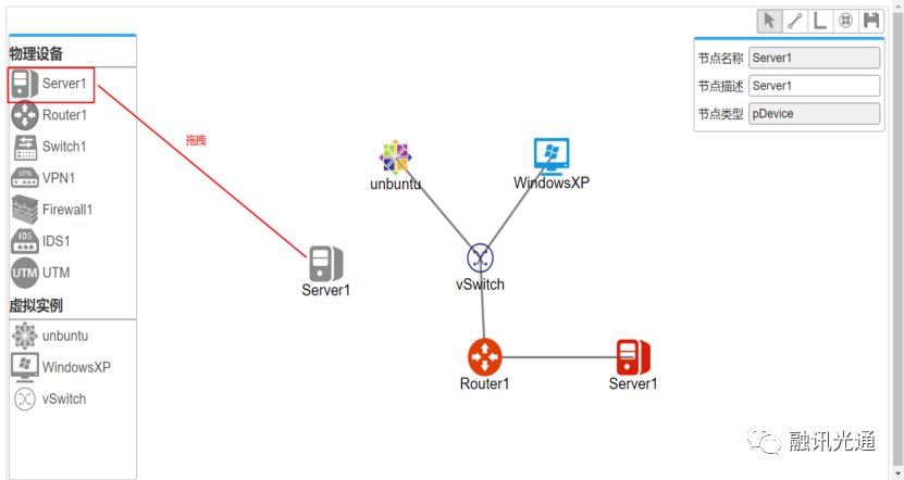 模板栏设计模块主要物理设备栏、虚拟路由交换栏、虚拟网关栏和终端栏;操作栏包含拓扑设计的各种操作;属性栏包含设备属性,支持设置设备属性;拓扑设计支持通过拖拽方式可视化地搭建网络拓扑。