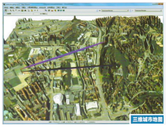 二维地图提供四种投影方式:国家坐标、墨卡托式投影、大圆投影以及正视图。计算结果可以层叠在背景地图上。同样可以提供三维地图,这种地图可以利用高度和陆地覆盖数据库来生成三维视图。右图显示的是集成到的城市三维地图。