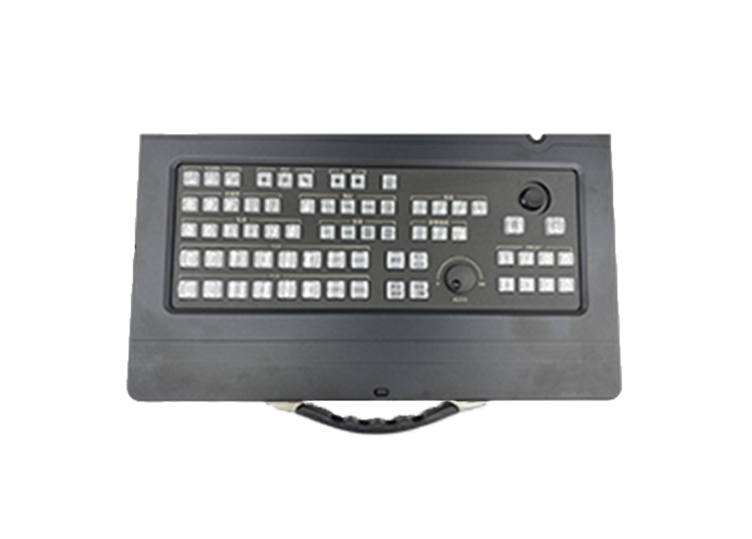 带有专业的导播键盘,触摸板鼠标。共有66个专业导播台按键。导播台支持三种系统模式控制。录制区域,录制、暂停、停止。直播区域、直播停止。画面分割区域,画中画、画外画等6组。角标区域,LOGO、DATE等。