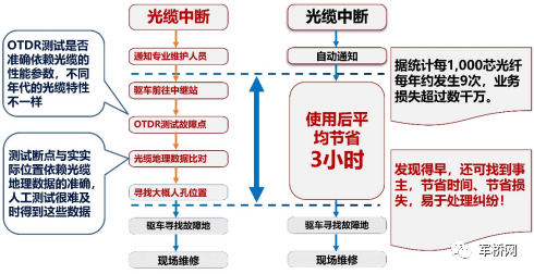 光缆故障定位困难:OTDR仪表只定位距离,传统资源数据不准确,未做标定和修正,E-OTDR定位精度欠佳。