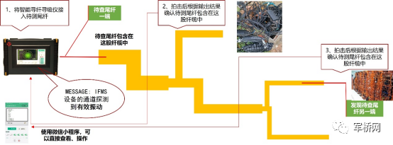 基于φ-OTDR技术的分布式光纤振动检测仪,利用光纤(光缆)传感传输二合一的特性,连续检测光缆沿线的振动。当有振动传导到光缆上时,相应位置的光相位发生变化,后向散射光将扰动信息回送到主机;通过测量注入光脉冲与接收信号的时间差定位扰动点,经过主机分析处理和智能识别,判断光缆是否经过当前位置并定位长度。手机APP上传位置、长度及现场信息到资管系统中,核准、修正资管中的光缆路由。