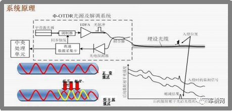 基于φ-OTDR技术的分布式光纤周界安防系统,采用光纤(光缆)作为传感传输二合一的器件,用光探测器探测向后散射的瑞利光。当光缆收到扰动时,相应位置的光相位发生变化,最终导致光强发生变化,通过测量注入光脉冲与接收信号的时间差定位扰动点,经过主机分析处理和智能识别,判断出不同的外部干扰类型,从而达到监测效果。