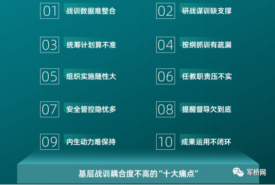 1.战训数据难整合;2.研战谋训缺支撑;3.统筹计划算不准;4.按纲抓训有疏漏;5.组织实施随性大;6.任教职责压不实;7.安全管控隐忧多;8.提醒督导欠到底;9.内生动力难保持;10.成果运用不闭环。