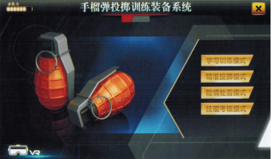 某司以VR模拟仿真技术、基于人体姿态识别技术、生物体征感知技术、虚实交互技术、握弹姿态校正技术和可视化技术为核心,结合手榴弹投掷训练课程及考核标准,建立VR手榴弹投掷训练装备系统;系统分为学习训练模式、精准投掷模式、险情处置模式和技能考核模式四个功能,各训练模式相互关联、层层递进,通过系统开展模拟训练有利于受训者提前熟悉投掷训练场地,提升心理适应能力,缓解投掷过程中的紧张情绪,规范作业动作,提高和巩固受训者的投弹技能,达到实弹考核的标准。