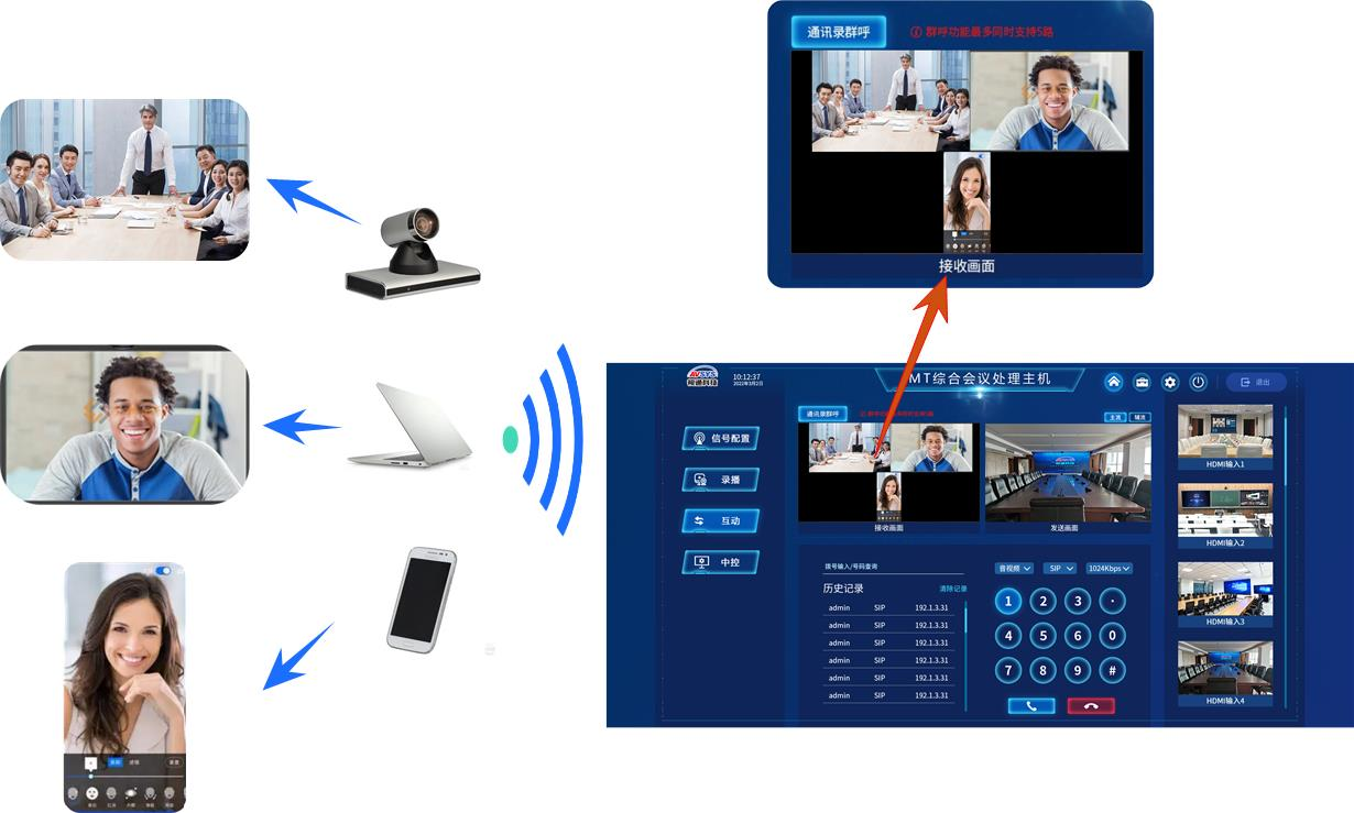 AS-MT1主机自带6方MCU,可对5路远端同时呼叫,加上本地组成1080P六方互动,支持联系人通信录、一键呼叫/挂断、群呼等会议管理。