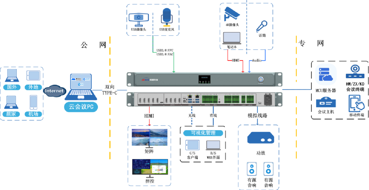 例如:在企业中,通常会部署专网视频会议进行总部与分部之间进行日常的远程视频会议。但是,当开会的过程中某个会议事件需要领导做决策时,恰好领导出差在外面,这个时候我们就可以采用“云会议”方式建立连接,通过一根Type-C线打通视频专网和云视频网,也保证了专网数据的安全性。