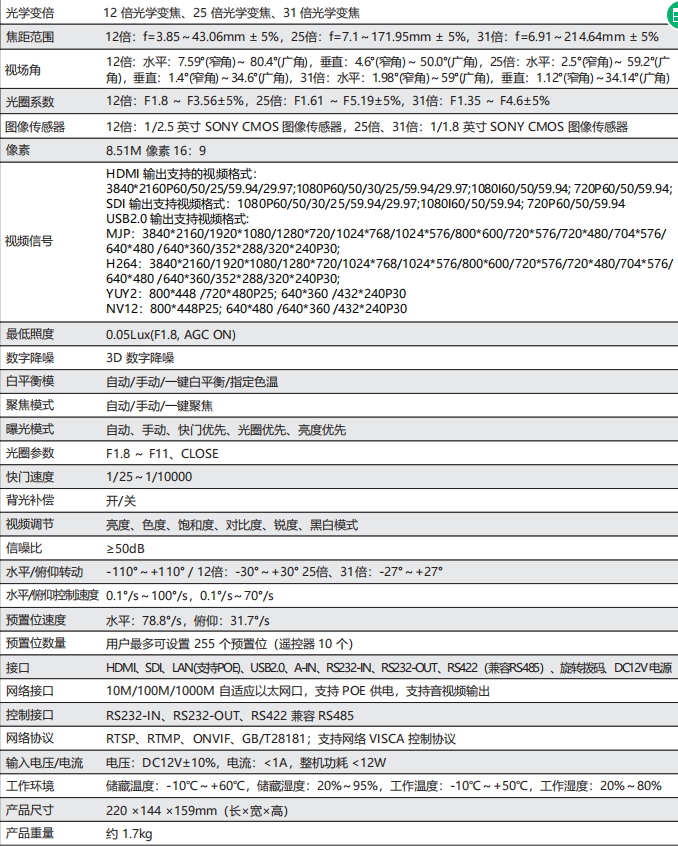采用 12X 光学变焦 80.4°广角镜头、25X 光学变焦 59.2°广角镜头、31X光学变焦 59°广角镜头。