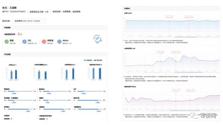 基于多种生理数据的特征提取、机器学习模型、模式识别算法,并结合训练任务绩效以及心理基线数据进行综合训练心理效能评估与分析,生成针对不同训练内容的个体训练评估报告。