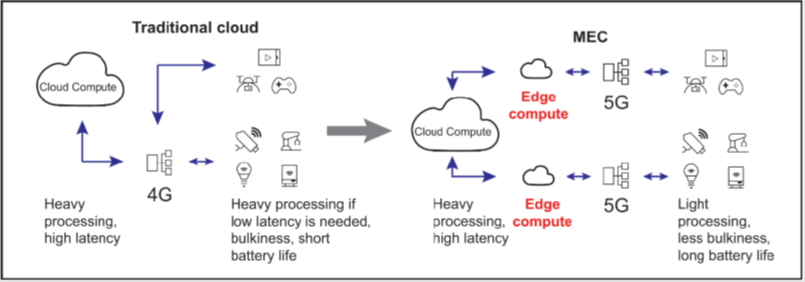 这种令人难以置信的网络能力与多接入边缘计算(MEC)相结合,为连接部队和即时共享时敏数据和信息提供了无限的技术可能性。MEC使云服务器能够在更靠近端点的地方运行,从而减少延迟并加快本地处理速度。图2显示了传统云结构与MEC网络之间的区别。