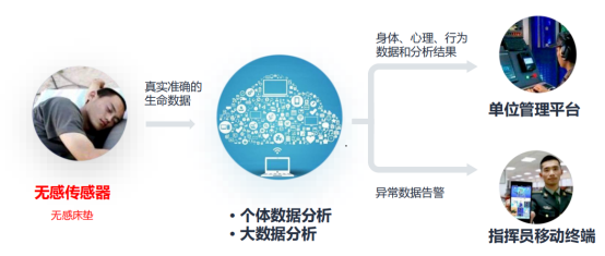 夜间查铺及精神焦虑监测系统通过智能传感器采集官兵在征数据,运用大数据和人工智能技术,推送官兵身体/心理和行为数据,提供检测、预警和分析服务,科学精准支撑部队政治/军事和管理工作。