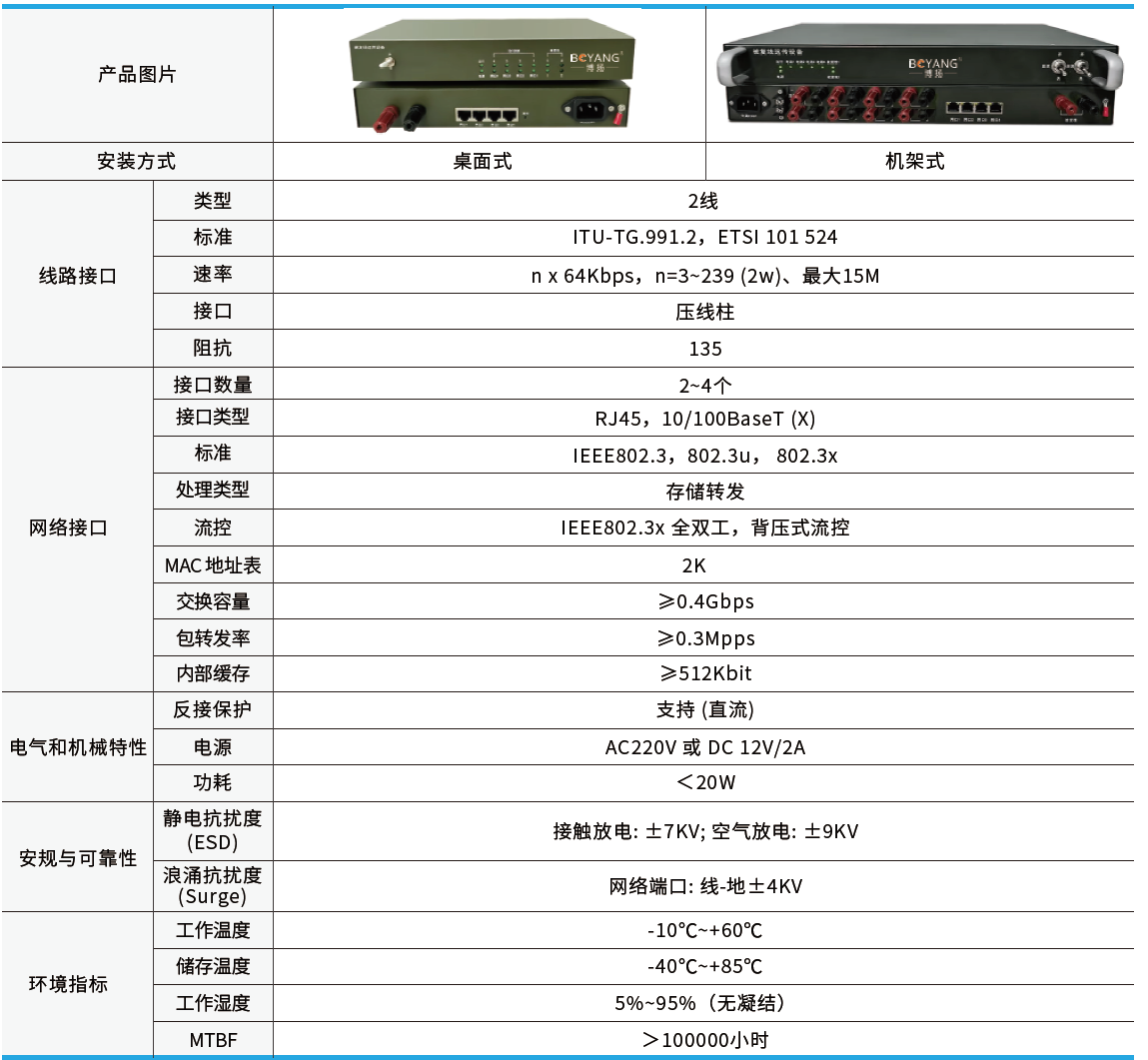 设备提供网络和电话同传、提供4路网络接口;提供1对被复线接口,点对点使用、最大带宽10M;可选1~4路程控电话业务,本型号提供2路电话;以太接口支持全双工和半双工网络通信,带有自动协商能力,MDI/MDI-X自适应无需手动调整本端设备有LED灯指示线路状态,传输距离最远可达6~10公里,自动检测无需设置;多种电源方式可选:AC220V、DC-48V、DC12V等可选。