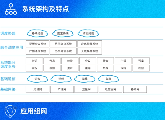 5、支持软交换调度和多网系融合通信能力:接入多媒体网关设备,无缝融合多种通信网络(IP、PSTN、GSM、CDMA、3G、4G、5G、TD-LTE专网、WiFi、模拟集群、数字集群、短波和超短波电台等),实现有线、无线融合,固网和移动网络的融合
