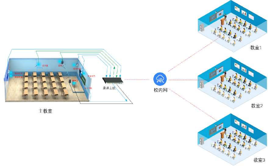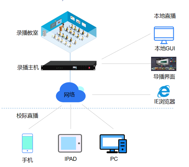 录播主机具有网络直播和远程推送双功能,即在进行网络直播时可再推送一路音视频流至广域网服务器,形成大规模的网络应用。用户也可以直接通过浏览器或PC客户端在校园网/城域网/广域网上进行接收观看,很好的兼顾了本校及校际间的直播,并满足了不同网络带宽用户的需求。