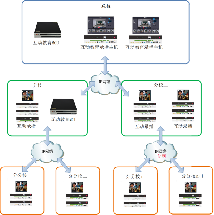 校级或教育局网络系统,可布置视频会议MCU,通用SIP协议与智能录播主机实现超大规模视频会议管理模式组网,在视频会议MCU系统中,智能录播主机被当成视频会议终端,无缝完成互动与教学应用。