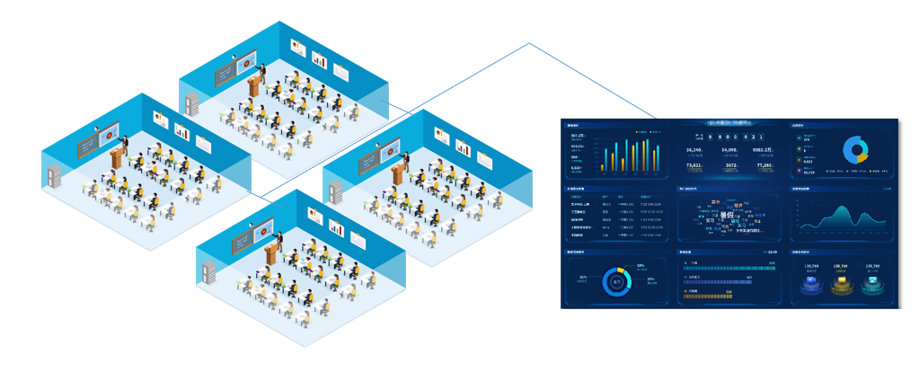 教学数据管理舱汇集了学校的教学资源数据、教室数据、课程数据、设备数据、用户访问数据等,通过数据建模,实现数据可视化展示。