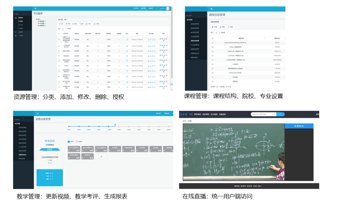 平台功能:资源管理、用户管理、教学管理、课程管理、日志管理、微视频应用、在线直播、在线点播、在线编辑、移动端浏览、个人空间、其它功能。