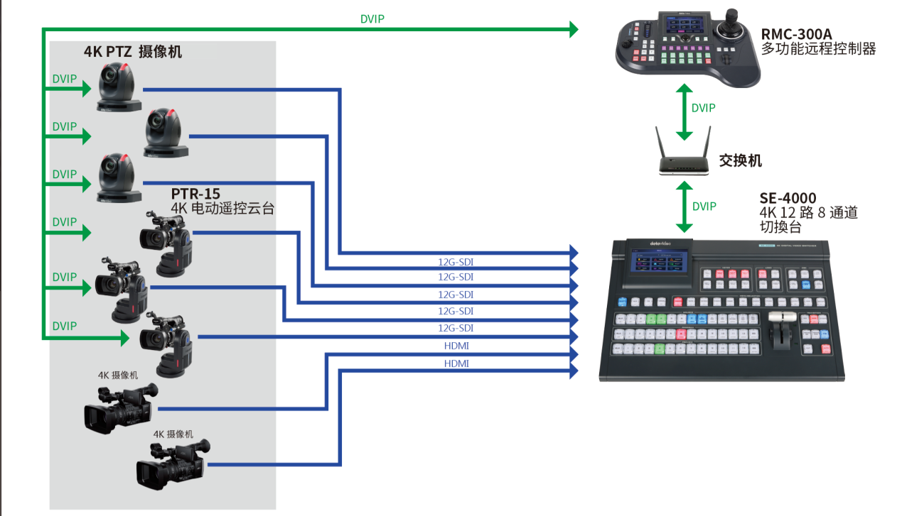 2023BIRTV,Datavideo洋铭将以“4K混合导播”为主题,带来全新4K 12路8通道导播系列产品SE-4000切换台。Datavideo SE-4000 是全媒体混合导播时代下应运而生的 4K 全功能切换台,具备广播指标的 UHD4K50/60,12G SDI和HDMI 2.0输入接口,既可用传统模式的实体全功能按键导播,也可用时尚便捷的 5英寸全彩 LCD 触控操作,实现“一键一功能”简单自在的节目创作;内建AUX、XPT、4路色键器抠像、PIP、DSK 以及颇受好评的 Stinger Transition 视觉效果等多种功能,可以轻松实现专业优质的各类型现场活动应用。