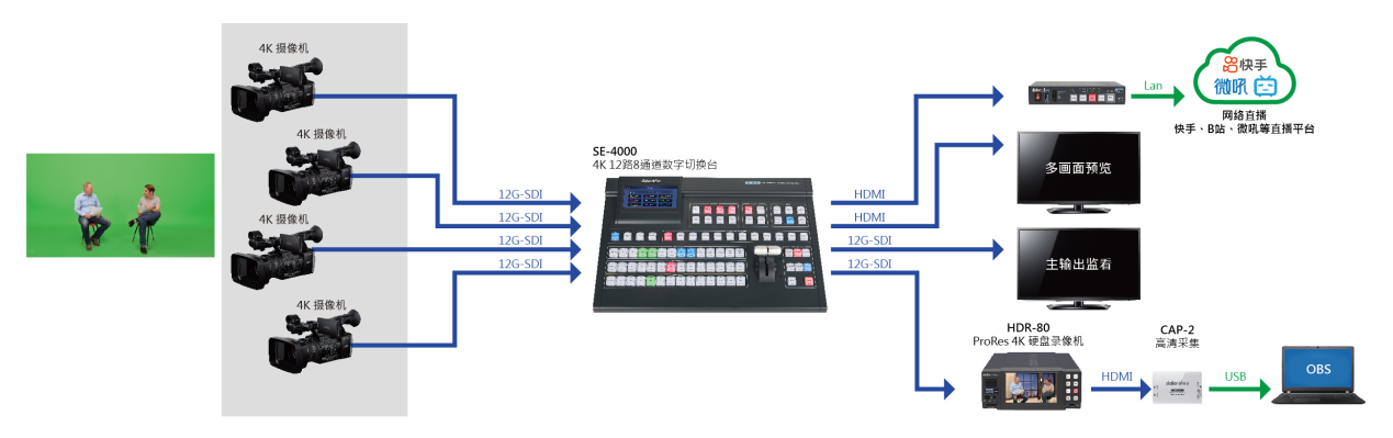 本次展会将以SE-4000的4路硬件抠像功能,展开全方位的四机位纯硬件虚拟演播室应用演示。