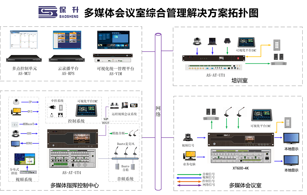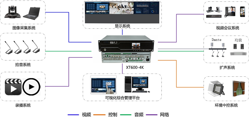 保升 XT600-4K 音频视综合一体机具备六大功能:AVCRTM六剑合一,包含音频处理器A、视频无缝混矩V、可编程中控C、录播编解码R、视频会议终端T、多方视频会议MCU,通过可视化综合管理平台将六大功能融合。