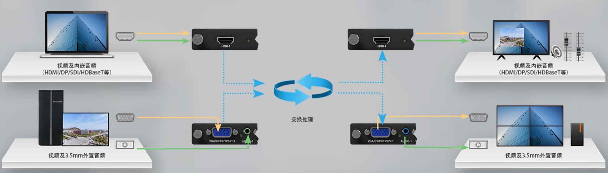 支持音频信号传输,灵活完成随路音频同步切换、音量调节、多路混音输出、音视频预案调用等操作,实现对音频信号的智能化管控。