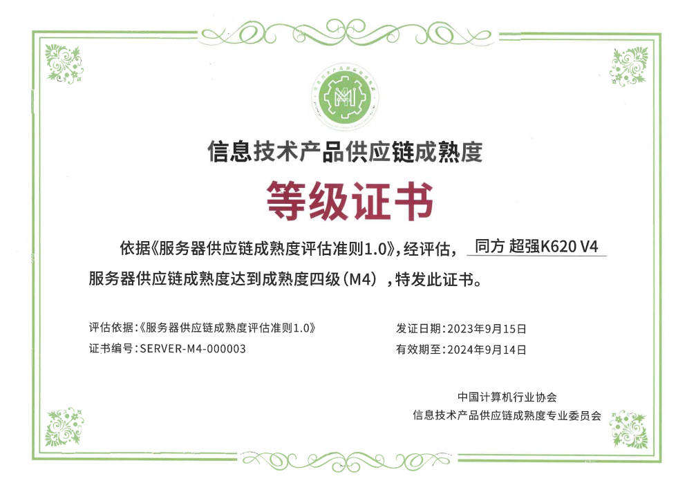 在本次大会上,同方超强K620 V4大放异彩,不仅成功入围“计算万物,数智共进”专题优秀成果展,同时在随后由中国计算机行业协会、工信部电子第五研究所主办,中国计算机行业协会信息技术产品供应链成熟度专业委员会承办的“信息技术产品供应链论坛”上,同方超强K620 V4获首批服务器供应链成熟度等级证书--成熟度四级证书,是首批证书中最高等级的三款服务器产品之一。