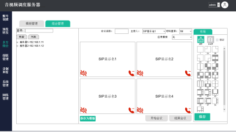 系统实现了在同一平台将视频监看、录制存储、按需推送、多方组会等多种功能进行综合应用。“一个服务器+一个终端”就能够实现对所有功能的支持、管理、应用。在综合调度台上,其对监控、会议、推送、录制、编辑、任务管理等多种功能进行全面融合,并将多种视频资源的显示、调度、管理都实现了高度集中。