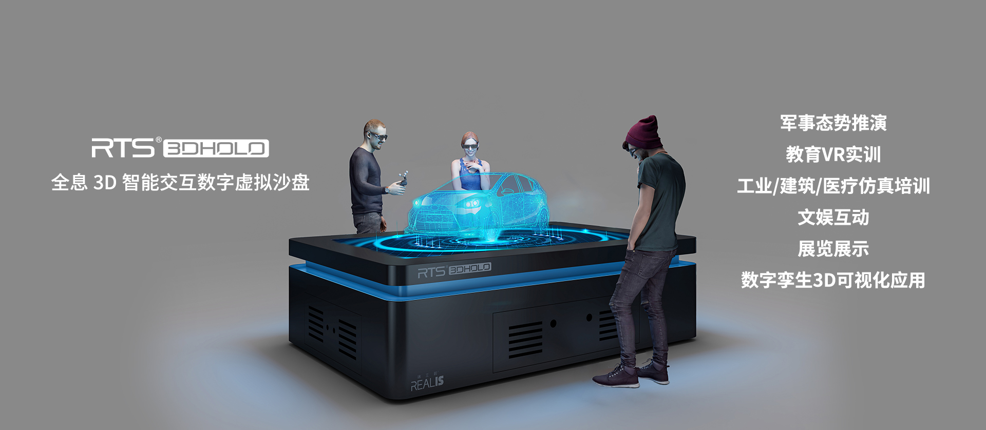 全息3D智能交互大屏显示系统 : 是全息3D智能立体交互系统应用于3D大屏幕显示的一种产品形态,通过无线操控手柄和全息3D场景内容实时操控,将3D显示载体以大型3D显示屏或者3D投影呈现。