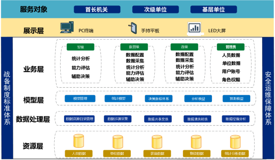 系统将战备要求,聚焦为人员管理、装备管理和物资管理三个方面,基于******进行人、装、物的量化管理,主要包括对象配置、编制管理、数据采集、辅助决策和统计评估等核心模块。系统实现各级部队战备工作的数据管理功能,并构建总体能力指标体系模型,对各单位遂行作战能力水平进行评估和结果展示。