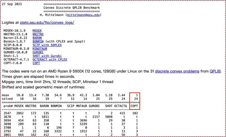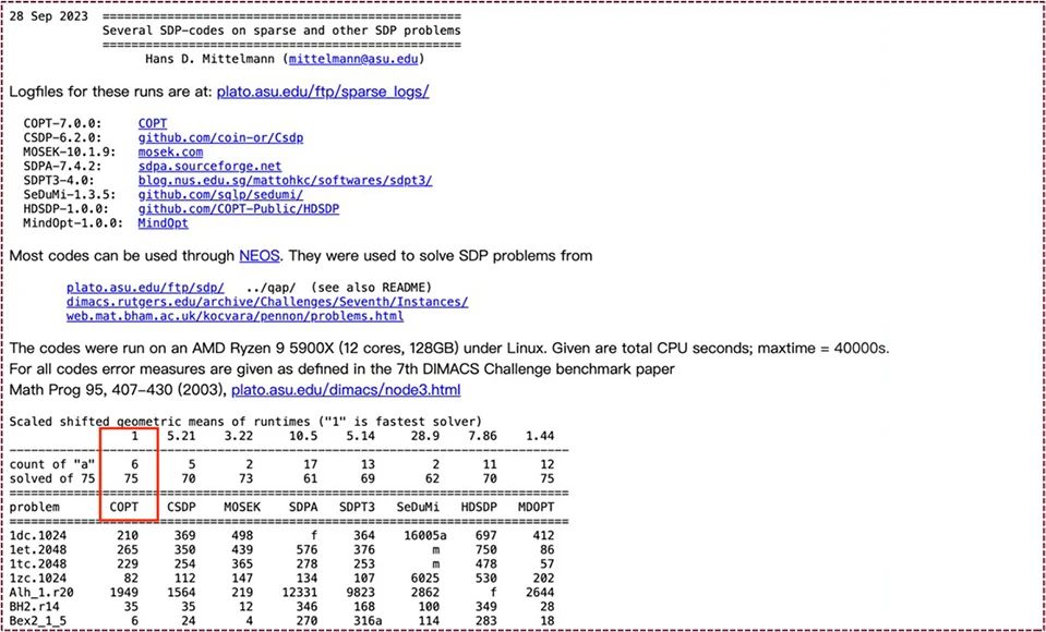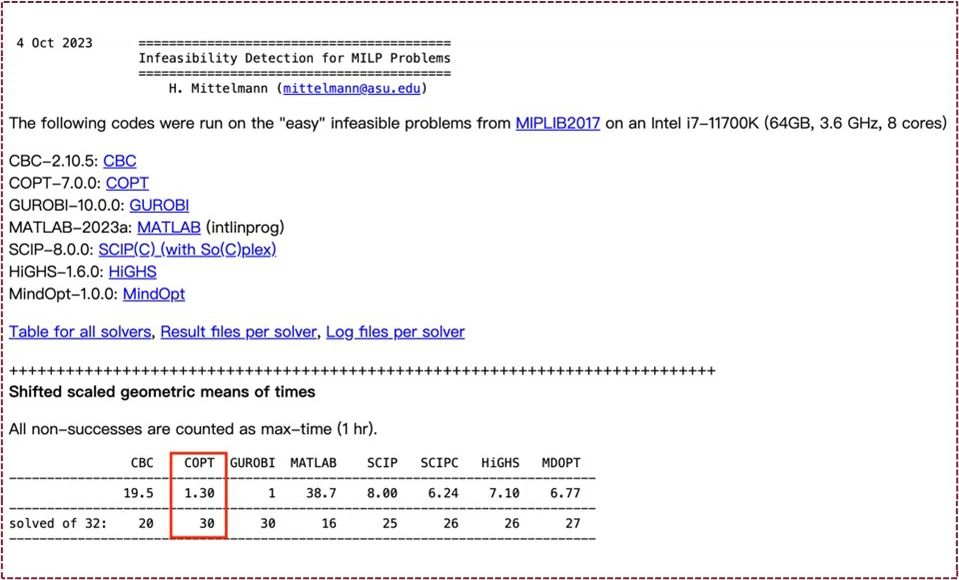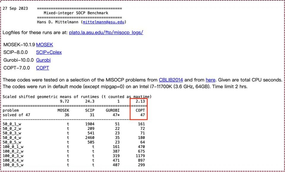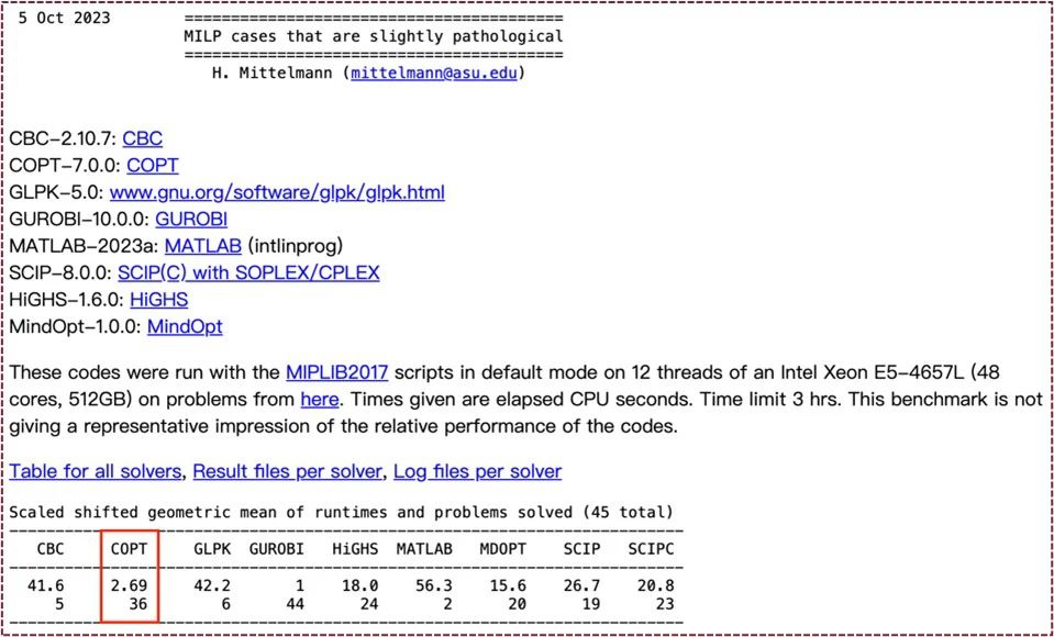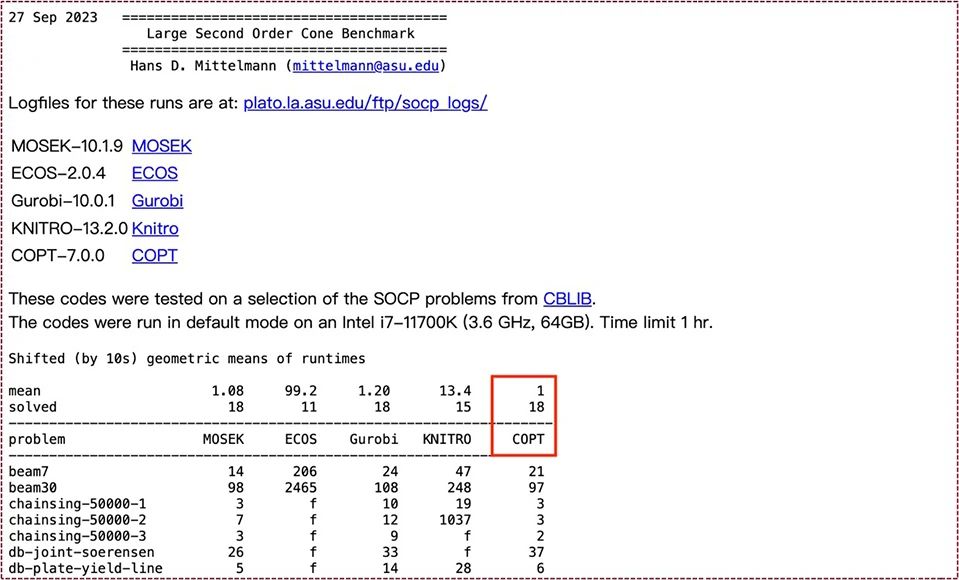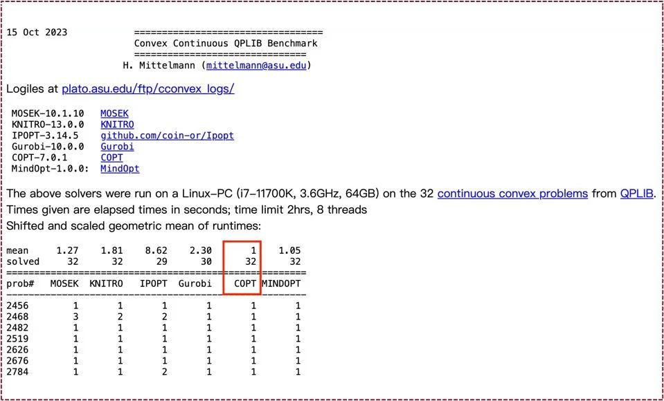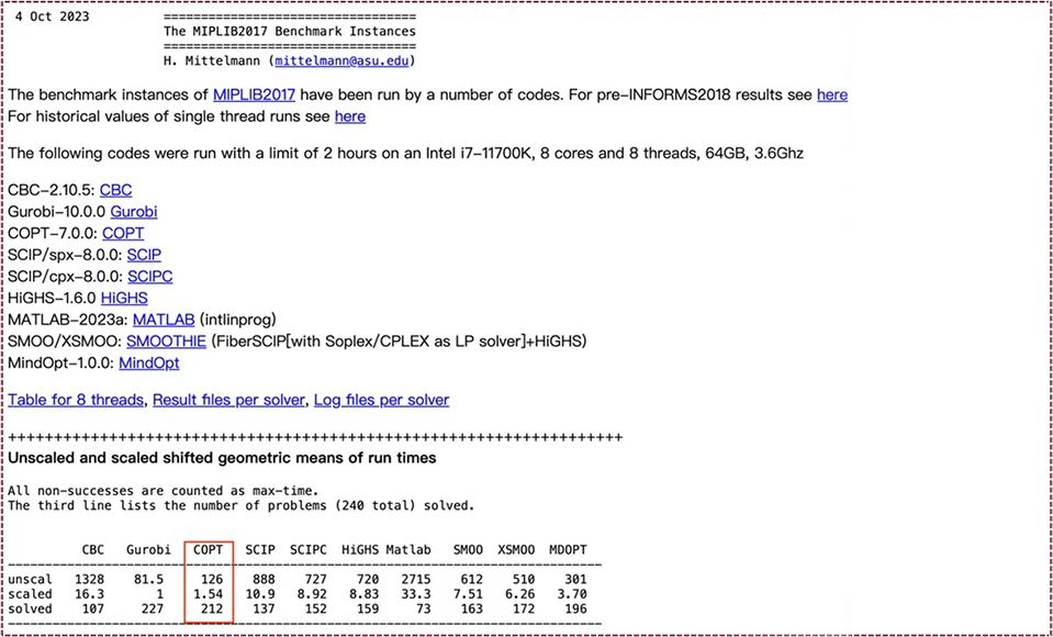 注:上表数据来源于美国亚利桑那州立大学Hans Mittelmann 教授维护的国际权威数学优化软件测评平台 http://plato.asu.edu/bench.html 2023年10月17日的测评结果。