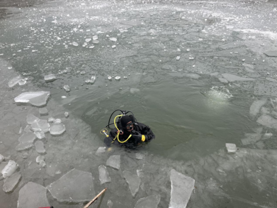 特训队员到达训练现场,穿戴好潜水装具后,佩戴我司自主研发的【深海通水声通信定位一体机 DTU-3000】及其他水下作业工具,凿开冰面,从冰洞口下潜。入水后,水下通信设备自动触发开始工作。