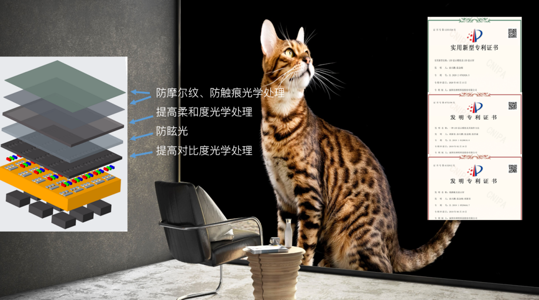 “产品的稳定性是重中之重。”洲明COB产品全系列采用“全倒装RGB Micro级芯片+自研固晶混编算法”,由于无需焊线,失效风险大幅降低;5面发光的芯片可以实现更高的亮度;同时具有高效的热管理管道,色彩显示稳定性更高、产品寿命也更长。