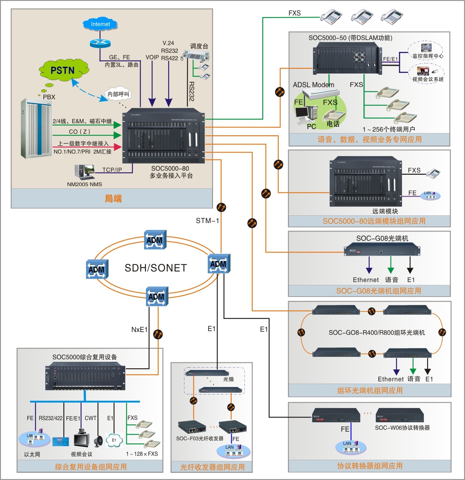 SOC5000-80多业务接入平台(MSAP)是申瓯通信设备有限公司设计的具有语音交换、光传输、PCM复用、信令汇接、64Kb交叉、2M交叉、2M汇聚、以太网汇聚等多种技术于一体的功能强大的多业务接入平台,实现语音、数据、图像(压缩和非压缩)的交换、汇聚与传输。根据不同组网的要求灵活搭建,从而满足客户专网业务需求。通过纳入SOC-NM2005综合网管平台,支持局端和远端全网设备的统一监控和管理;实现多级网管、远程管理;对网络实行集中操作、维护和管理(OAM)功能,实现电路的配置和调度。操作简单易用,提高网络运维效率,降低网建运维成本。