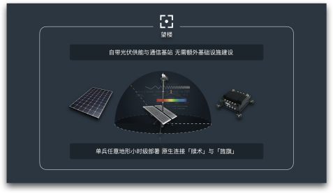 望楼支持在极端恶劣的各类环境下快速移动部署,单兵在任意地形小时级时间内即可完成搭建与配置,开机即可原生连接后端“牍术”与“旌旗”。同时,望楼自带光伏供能系统与通信基站,从而无需额外拉电拉网等基础设施建设。